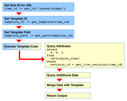 In general, there is an initial resolution step in which the server must identify the appropriate content item and then decide which template to actually parse. Following that is an execution step, during which setup tasks associated with the template are performed. Finally, the merging step combines the data and layout into a rendered page.